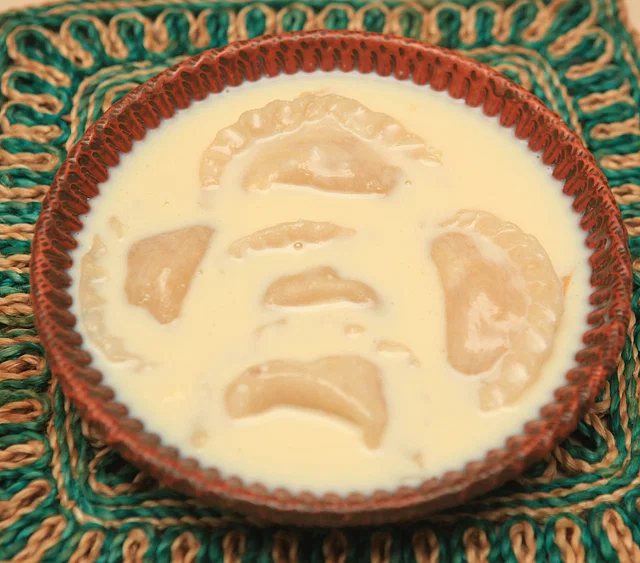 প্রণালি: নারকেলের দুধ ফুটিয়ে লবণ, চালের গুঁড়া, ময়দা দিয়ে সেদ্ধ হলে নেড়ে নামিয়ে নিন। এবার ভালো করে মথে ২০ ভাগ বা পছন্দমতো ভাগ করে, প্রতি ভাগ হাতের আঙুল দিয়ে চেপে চেপে বাটির মতো আকার করে ১ টেবিল চামচ পুর দিয়ে মুখ বন্ধ করে অর্ধচন্দ্রাকারে করে ২০-২৫ মিনিট ভাপে সেদ্ধ করে গরম অবস্থায় ঘন দুধে দিতে হবে, ঠান্ডা হলে পরিবেশন করতে হবে।